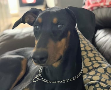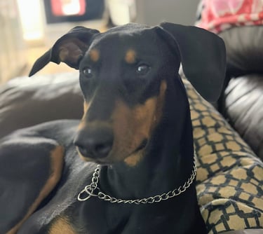 Freya is the newest addition to our family. We adopted her from Bluegrass Doberman Rescue and she is Roxie's bestie. She loves to cuddle and is becoming a well-versed training role model dog.